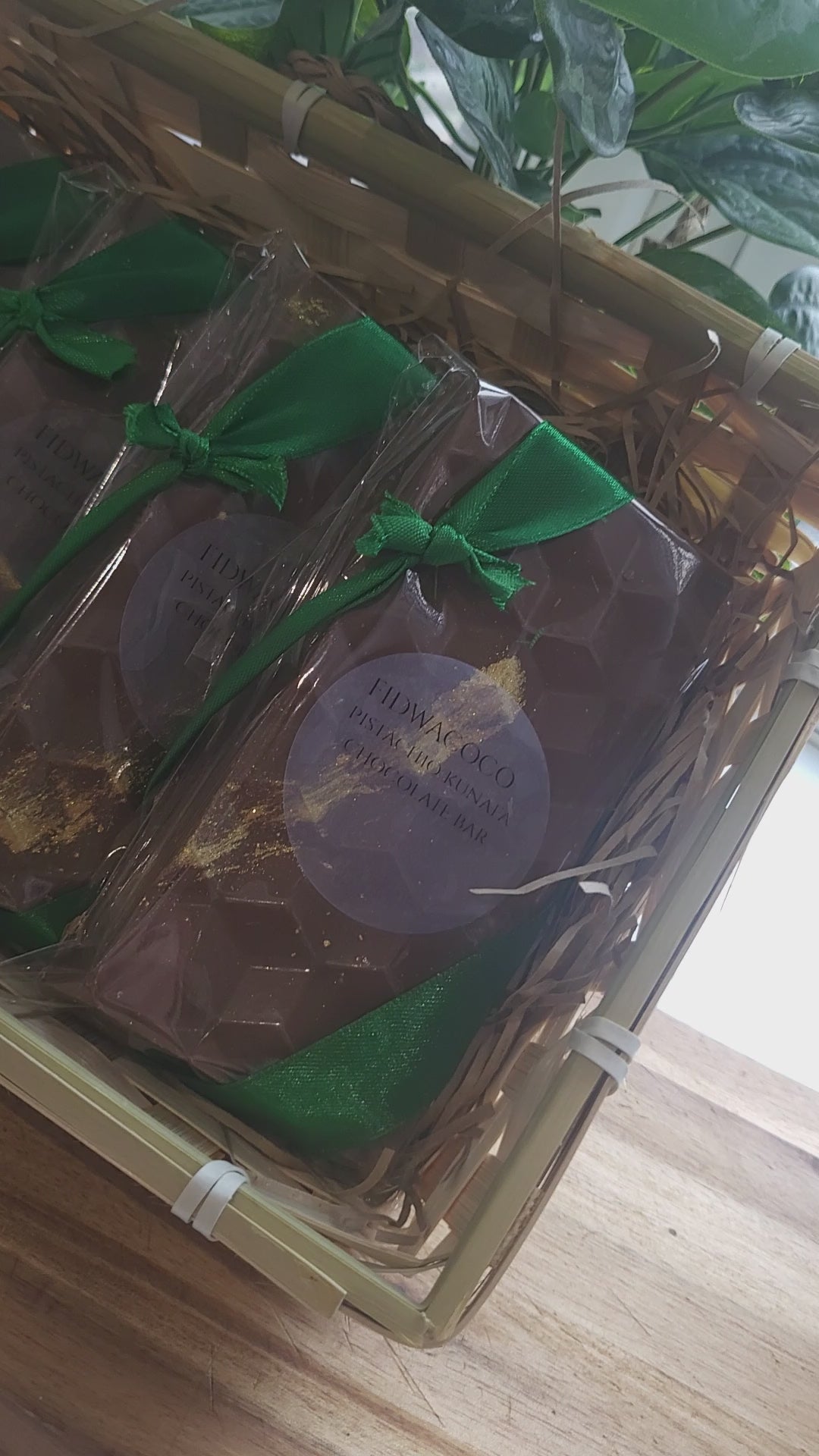 Indulge in the perfect gift or treat for yourself with our luxurious chocolate hamper. Choose between 5 Pistachio Kunafa bars or a mixed hamper set featuring 2 Pistachio Kunafa, Nutella Kunafa, White Hazelnut Kunafa, and a Baklava Bar